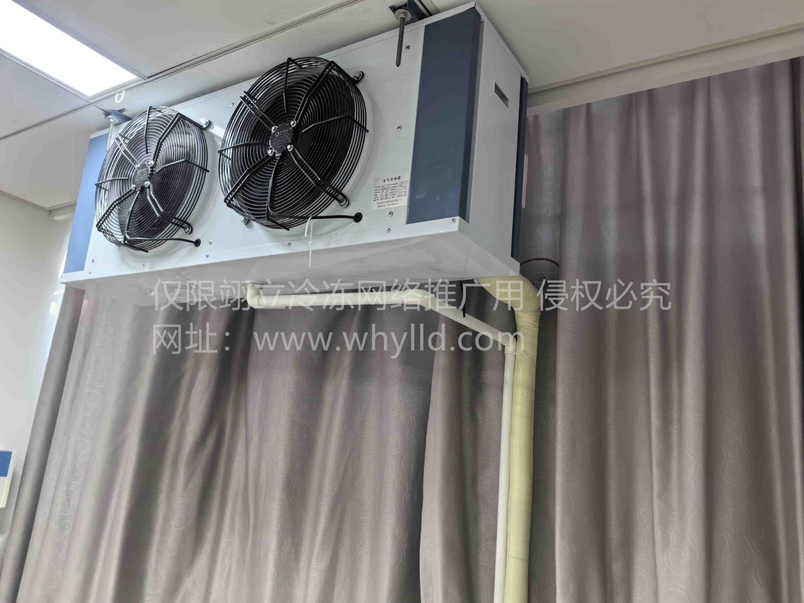 陰涼庫(kù)采用一臺(tái)美樂(lè)柯牌風(fēng)冷箱式制冷機(jī)組(核心部件艾默生谷輪全封閉渦旋壓縮機(jī)ZB21KQ中高溫機(jī)組);蒸發(fā)器DL55(4.5mm翅片距)冷風(fēng)機(jī);節(jié)流機(jī)構(gòu)采用丹佛斯熱力膨脹閥(性能可靠穩(wěn)定);系統(tǒng)閥件采用銅制閥件;